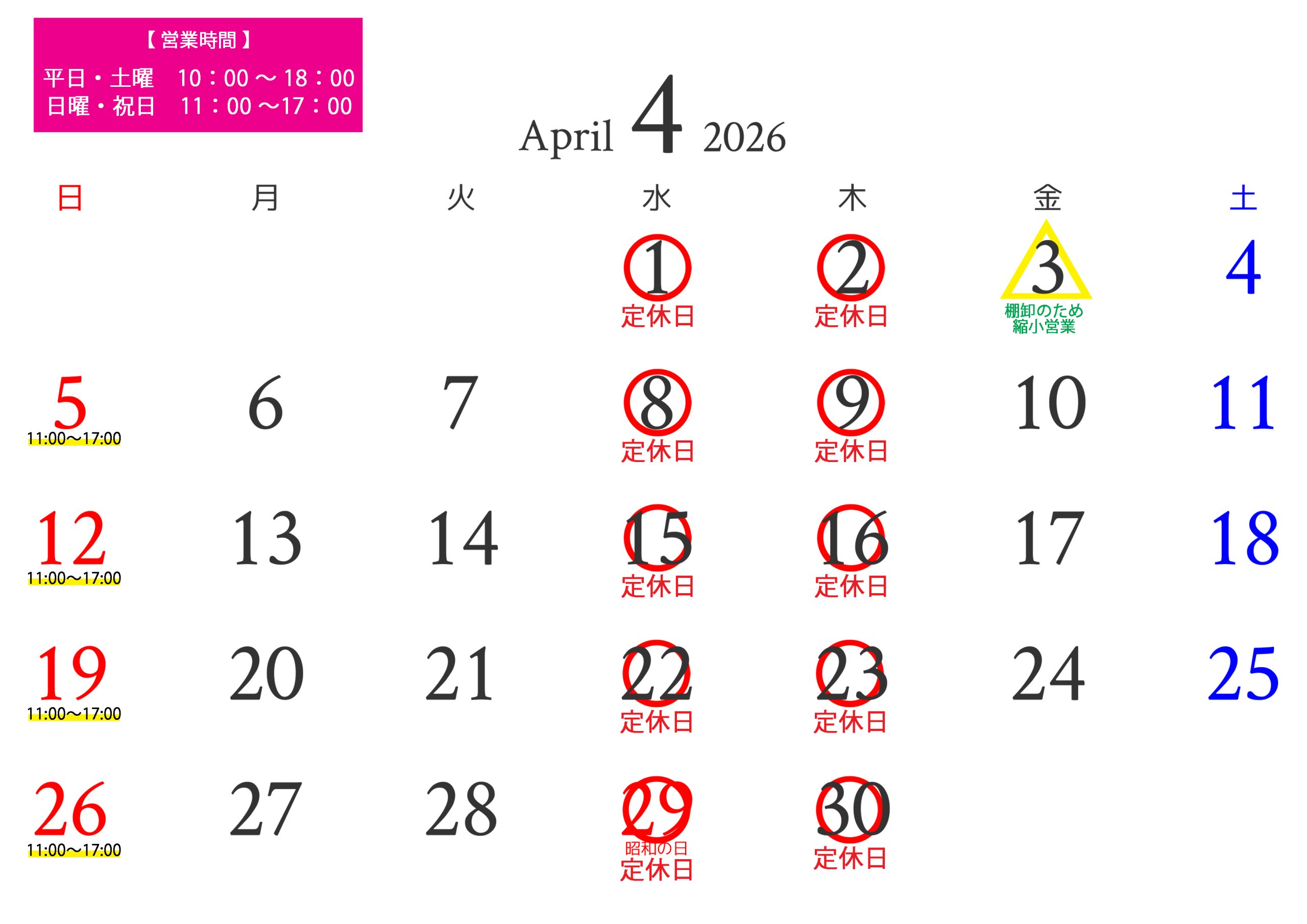 4月の営業時間と定休日について