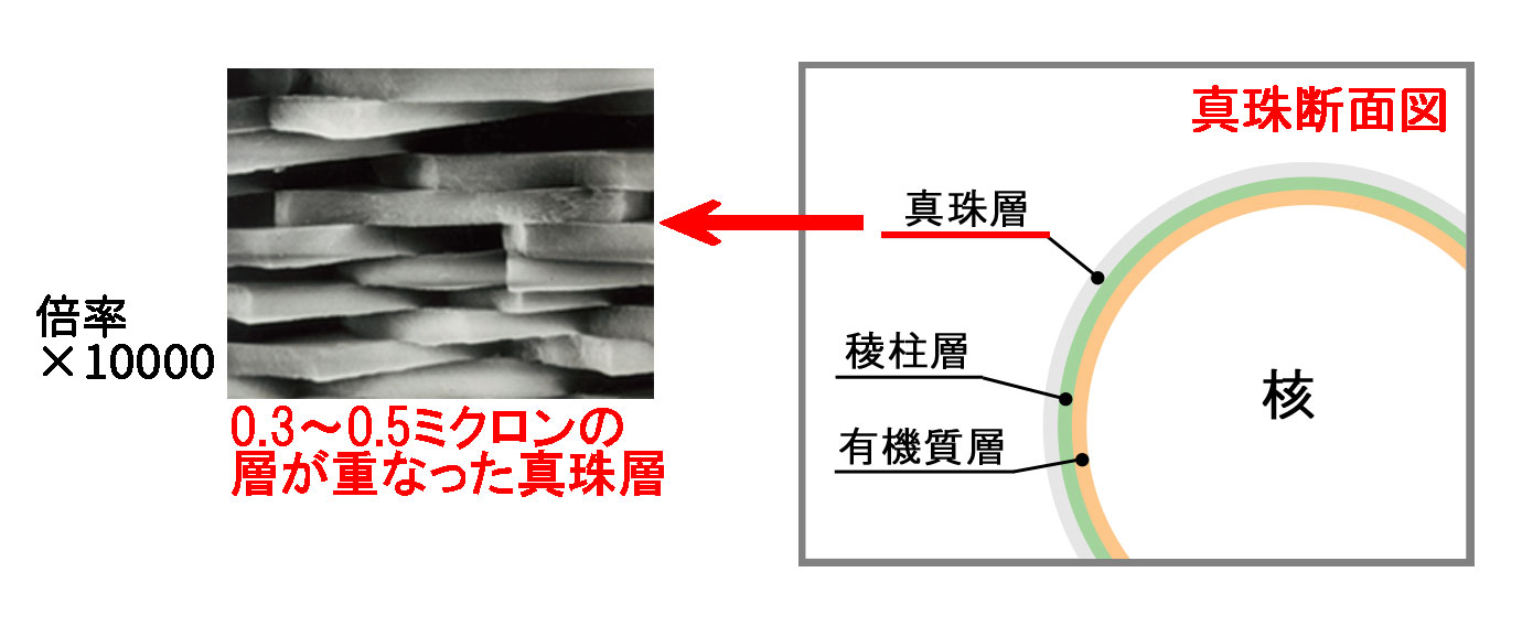 真珠は、タンパク質と炭酸カルシウムが交互に積み重なって千層以上の結晶層から構成されています。真珠層1層の厚みは0.3〜0.5ミクロン(1ミクロン0.0001mm)。